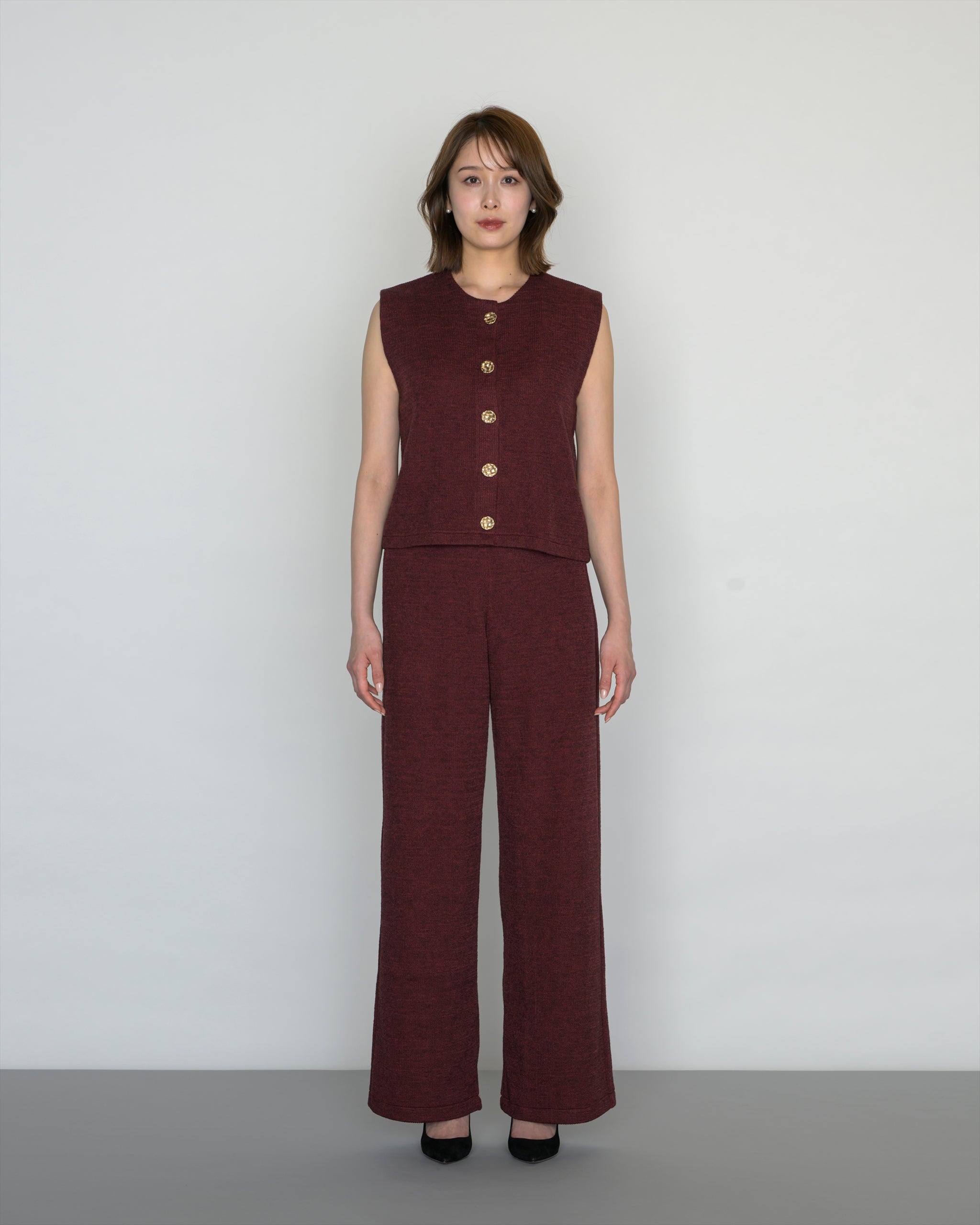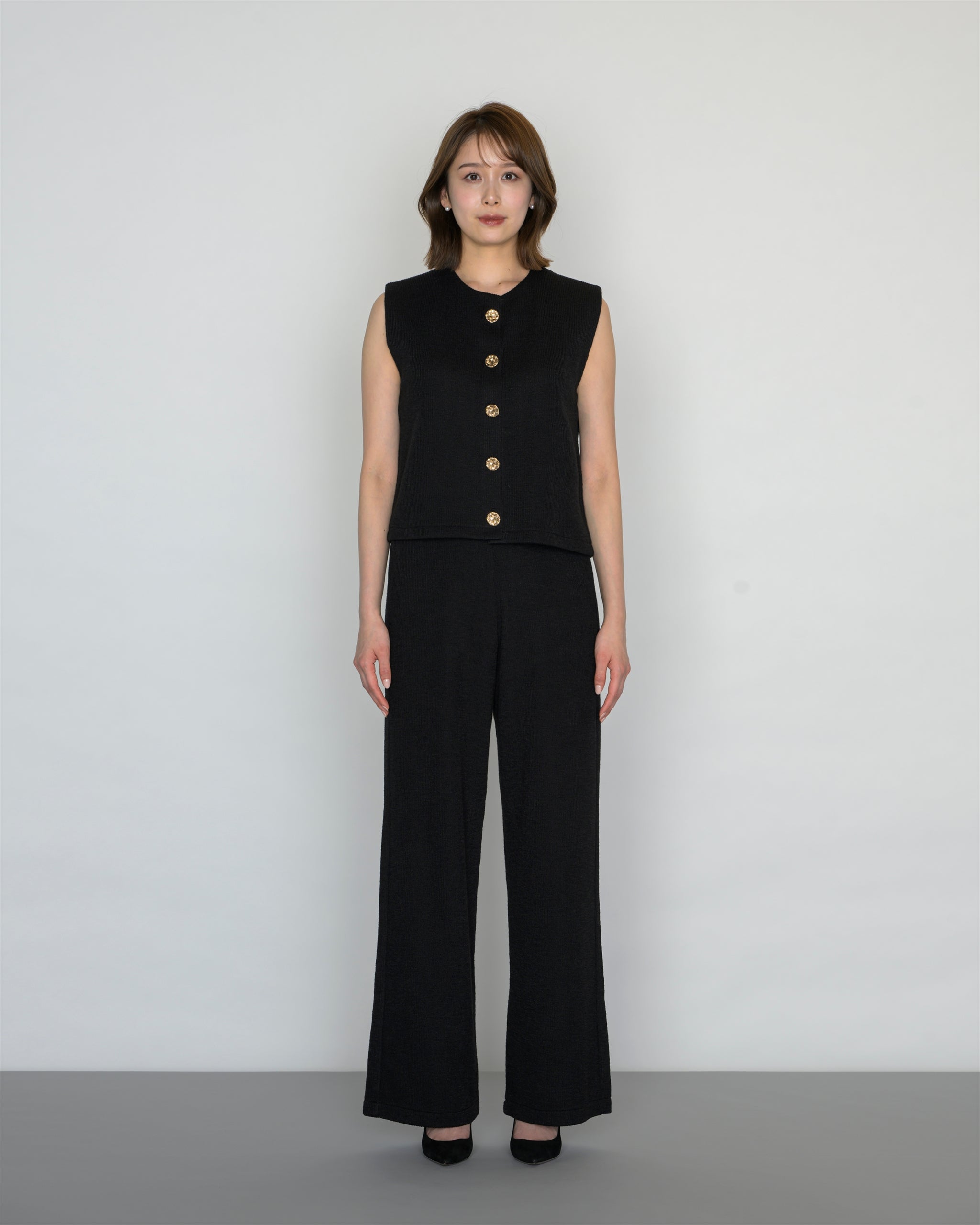トップスは金ボタンと肩パッドがアクセントとなり、都会的で洗練された印象に。肩パッドがニット特有のシルエットの崩れを補正し、ラインをシャープに整えながら、二の腕をすっきりと見せます。